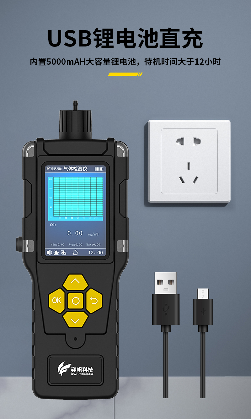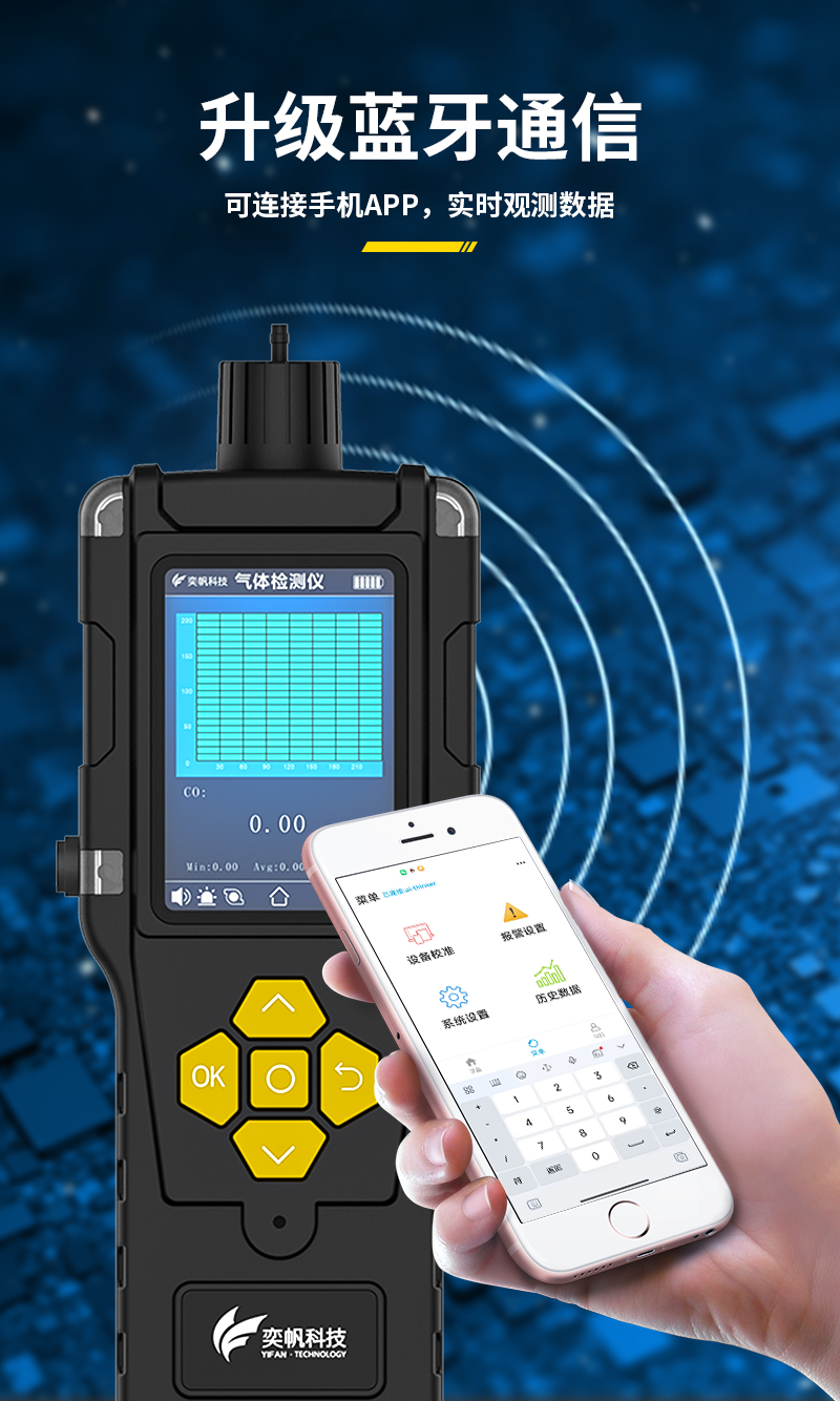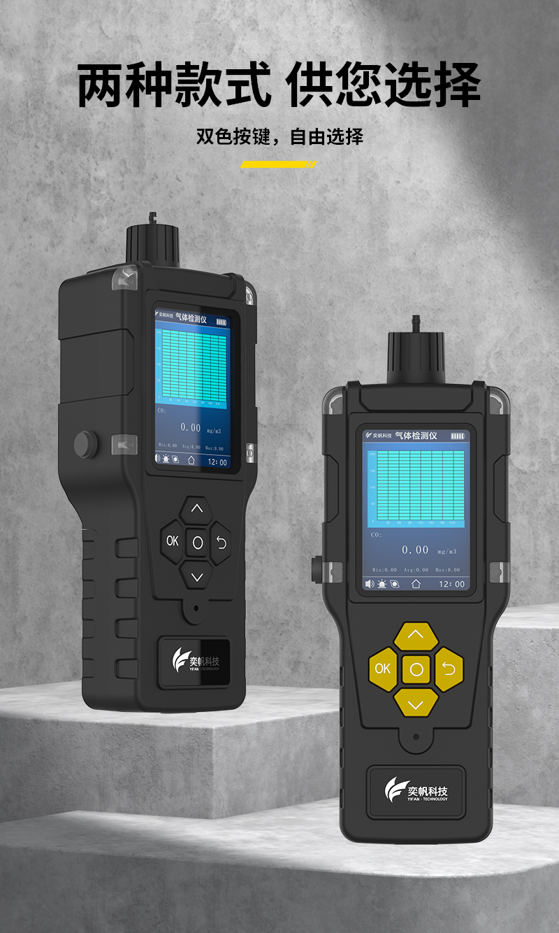 YF-2000-X2奕帆科技泵吸二合一手持氣體檢測儀,可同時檢測兩種氣體;是一款數字化多功能氣體檢測儀,適用于測量各類氣體濃度它具有實時數據監測和氣體溫濕度監測,一段時間內的最大值、最小值、平均值數據,能存儲一百萬條歷史數據,可以連接藍牙打印機,支持屏幕截圖,連接電腦導出圖片,提示下次校準倒計時功能等功能。采用泵吸式測量,具備防水,防塵,防震,抗靜電,抗電磁干擾,內置水汽、粉塵過濾器,防止因水汽和粉塵損壞傳感器和儀器。配置3.5寸高清液晶彩屏實時顯示、5000mAH大容量電池超長待機、聲光振報警功能。(兩種款式可選)