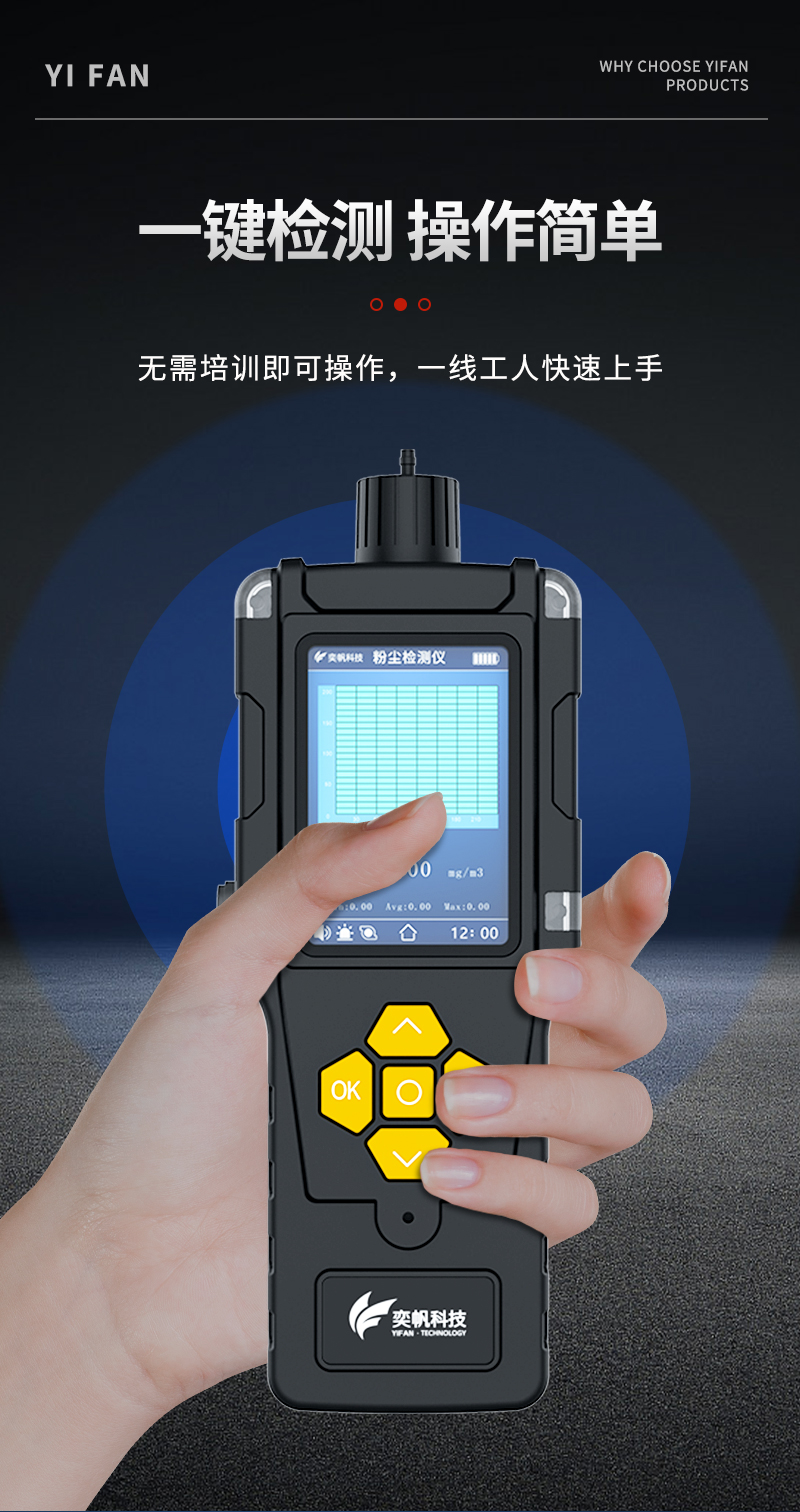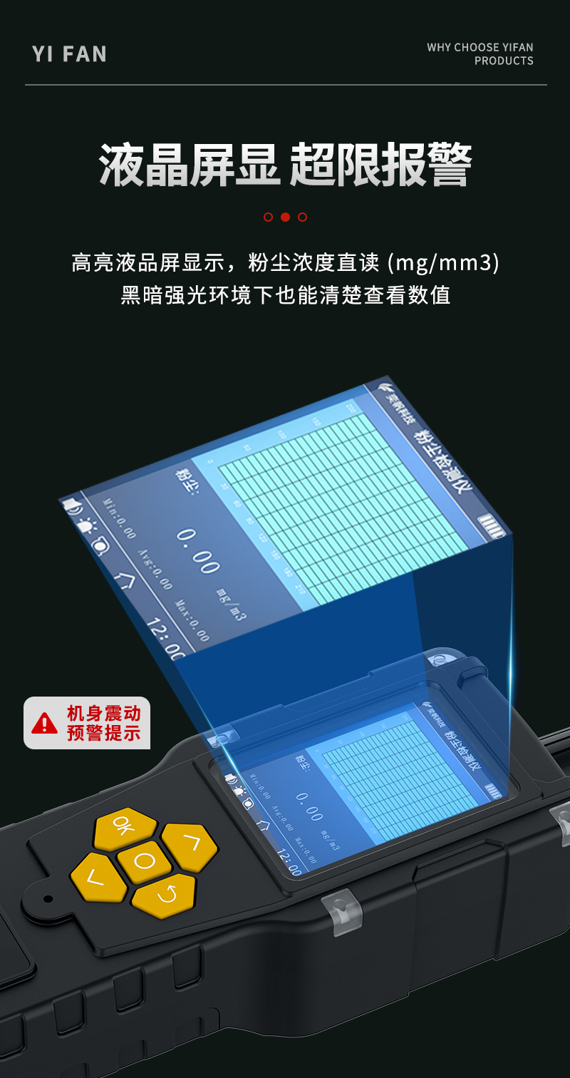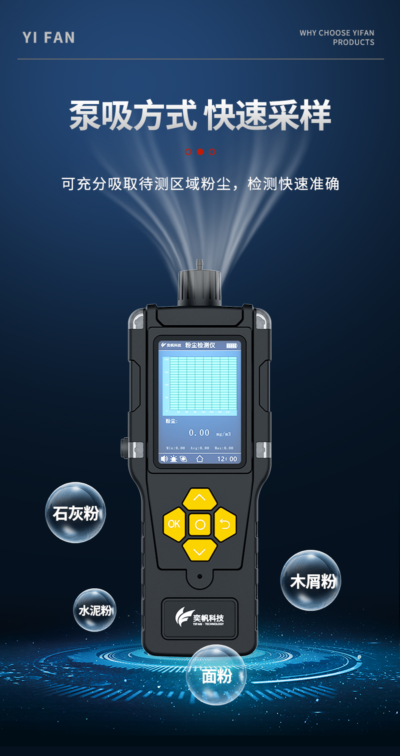 YF-2000-PM奕帆科技泵吸粉塵檢測儀,是一款數(shù)字化多功能粉塵檢測儀,用于工廠車間中粉塵顆粒物(TSP)濃度檢測及超標報警。它具有實時數(shù)據(jù)監(jiān)測和氣體溫濕度監(jiān)測,一段時間內(nèi)的最大值、最小值、平均值數(shù)據(jù),能存儲一百萬條歷史數(shù)據(jù),可以連接藍牙打印機,支持屏幕截圖,連接電腦導出圖片,提示下次校準倒計時功能等功能。