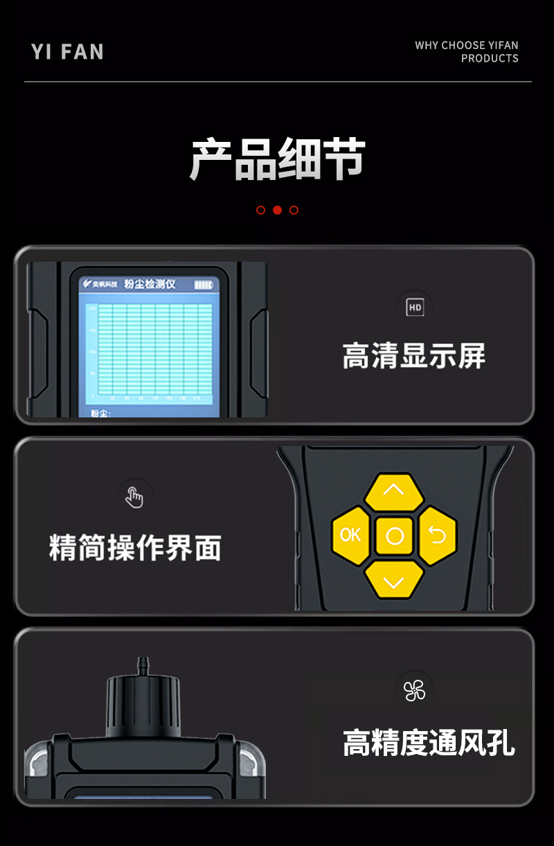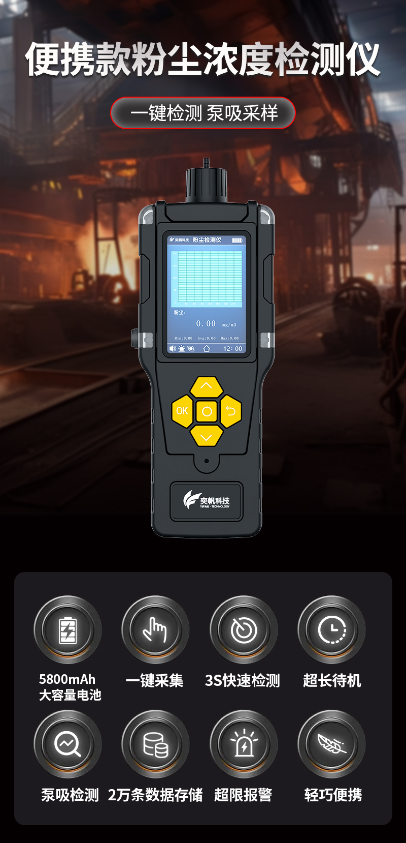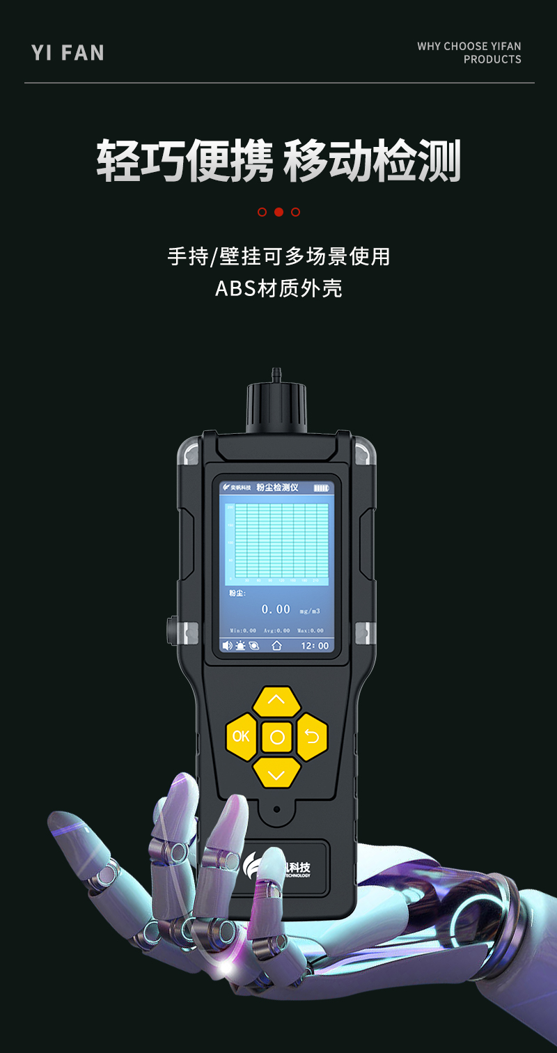 YF-2000-PM奕帆科技泵吸粉塵檢測儀,是一款數(shù)字化多功能粉塵檢測儀,用于工廠車間中粉塵顆粒物(TSP)濃度檢測及超標報警。它具有實時數(shù)據(jù)監(jiān)測和氣體溫濕度監(jiān)測,一段時間內(nèi)的最大值、最小值、平均值數(shù)據(jù),能存儲一百萬條歷史數(shù)據(jù),可以連接藍牙打印機,支持屏幕截圖,連接電腦導出圖片,提示下次校準倒計時功能等功能。