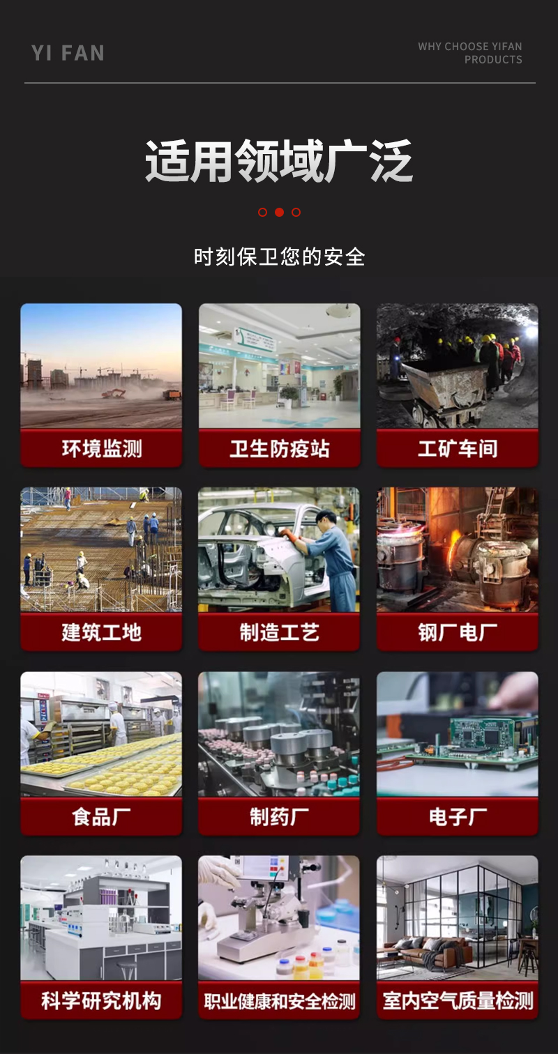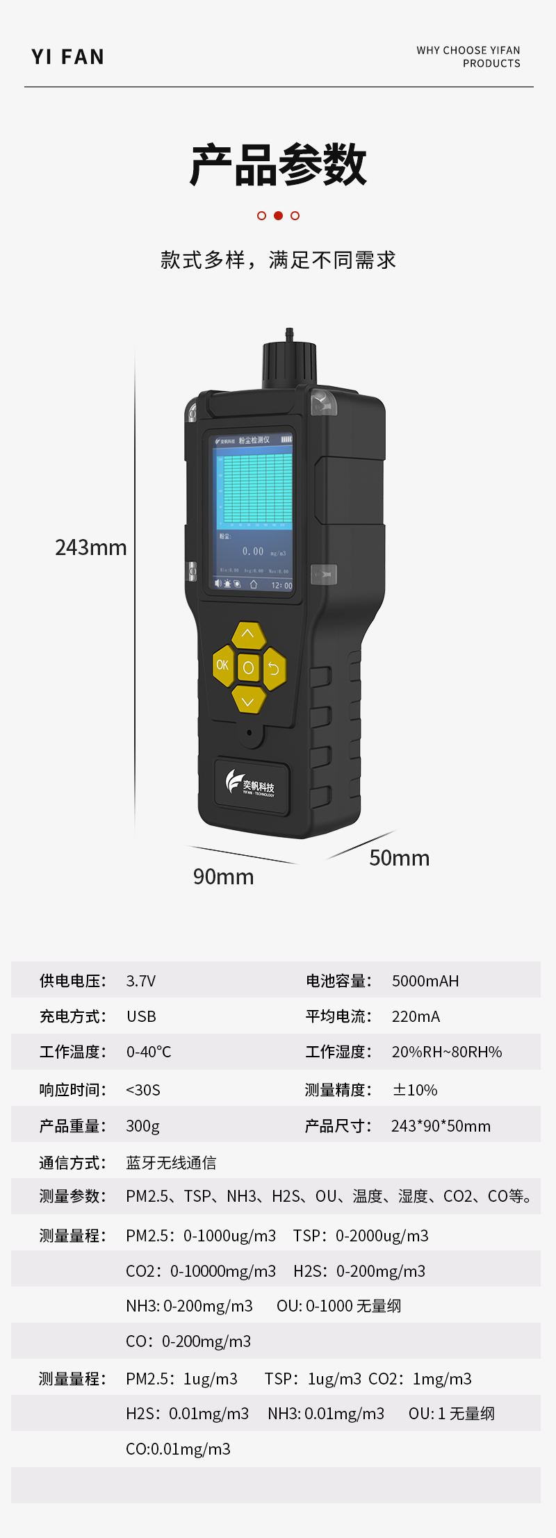 采用泵吸式測量,具備防水,防塵,防震,抗靜電,抗電磁干擾,內(nèi)置水汽、粉塵過濾器,防止因水汽和粉塵損壞傳感器和儀器。配置3.5寸高清液晶彩屏實時顯示、5000mAH大容量電池超長待機、聲光振報警功能。(兩種款式可選)