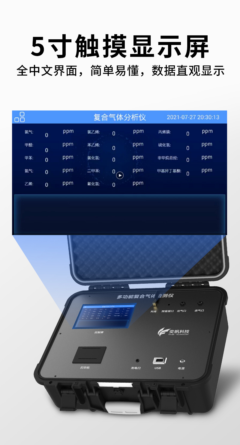 YF-900A奕帆科技便攜式氣體分析儀,適用于各種工業(yè)環(huán)境和特殊環(huán)境中的多種混合氣體濃度檢測,傳感器是選用進口高精度電化學(xué)傳感器和光學(xué)紅外原理,采用泵吸式采樣方式監(jiān)測,內(nèi)置除水除塵過濾器,可以很好的保護傳感器不受侵害。響應(yīng)速度快,測量精度高,穩(wěn)定性和重復(fù)性好,整機性能居國內(nèi)領(lǐng)先水平,各項參數(shù)用戶可自定義設(shè)置,操作簡單。內(nèi)部采用16000mA大容量可充電池,超長待機,采用7寸高分辨率工業(yè)觸摸顯示彩屏,完美顯示儀器的各項技術(shù)指標(biāo)和氣體濃度值,可在屏幕上直觀查看歷史數(shù)據(jù),具有數(shù)據(jù)打印、數(shù)據(jù)存儲、無線傳輸、超標(biāo)報警、同時具備24小時連續(xù)監(jiān)測等多種功能。
