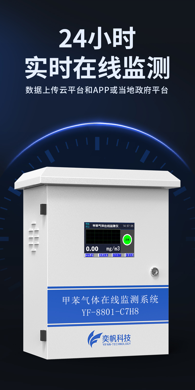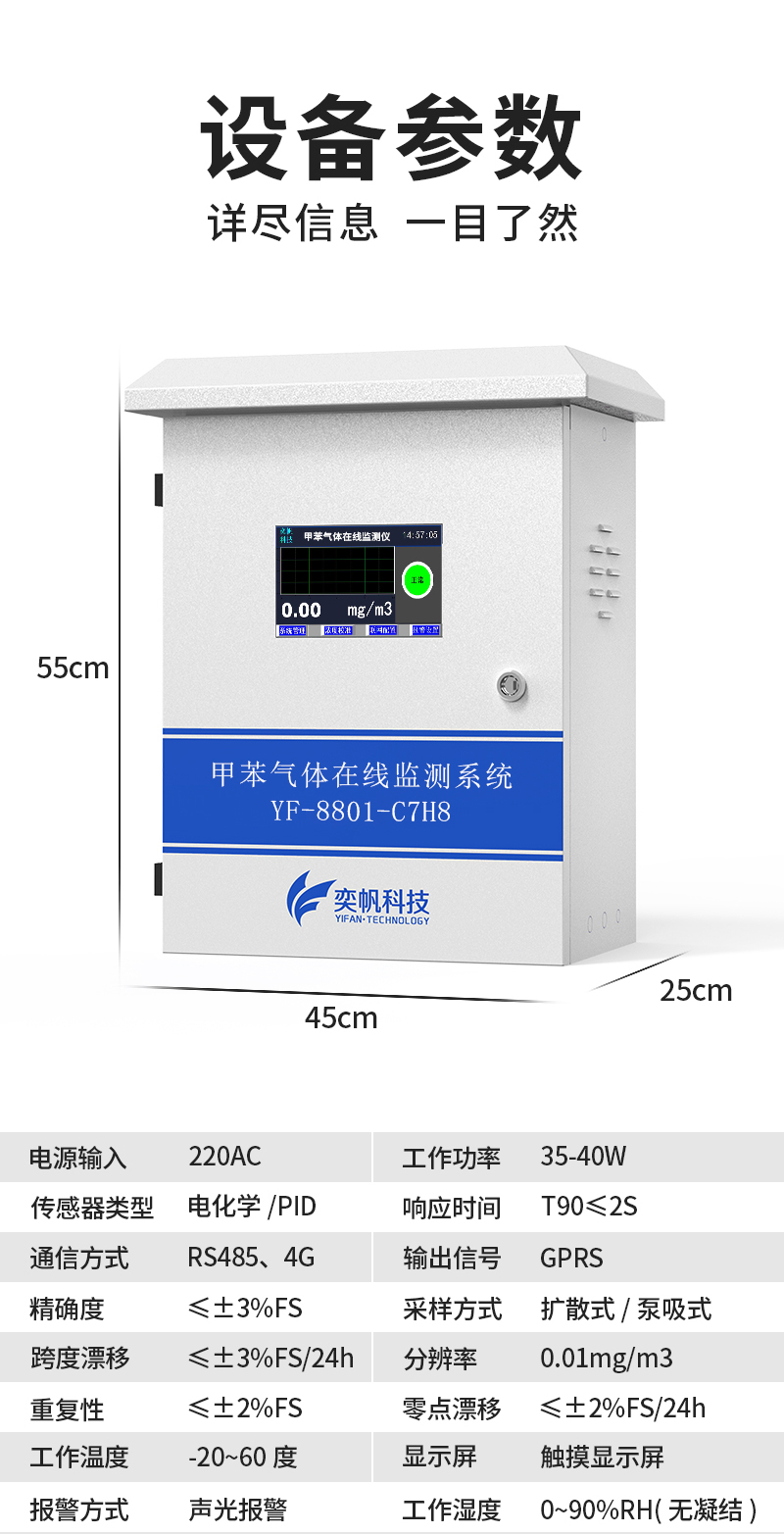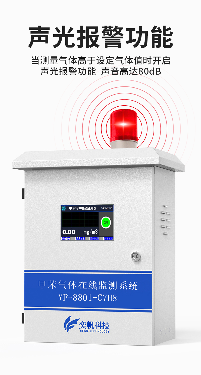 YF-8801-TX奕帆甲苯在線監測系統,由奕帆科技自主研發,適用于連續監測無組織環境空氣中的甲苯等有機化合物,產品配備高精度傳感器,采用泵吸式采樣監測,內置多重預處系統,包括除塵除水過濾等,可以很好的保護傳感器不受侵害,保證監測數據的準確穩定。奕帆甲苯在線監測系統具備24小時連續監測、超標報警、數據儲存等功能,同時數據還可對接環保平臺。